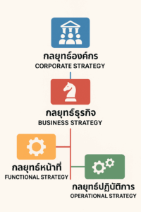 ประเภทของกลยุทธ์ในองค์กรมีความสำคัญในหลายๆ ด้าน โดยเฉพาะการกำหนดทิศทางการดำเนินงานขององค์กรและการสร้างความสำเร็จในระยะยาว โดยสามารถแบ่งประเภทกลยุทธ์ออกเป็น 3 ประเภทหลักๆคือ 1.กลยุทธ์ระดับองค์กร(Corporate Strategy) คือการวางแผนและการตัดสินใจที่เกี่ยวข้องกับการกำหนดทิศทางและโครงสร้างขององค์กรในระยะยาว โดยมุ่งเน้นในการสร้างความได้เปรียบทางการแข่งขันและการเจริญเติบโตขององค์กร...