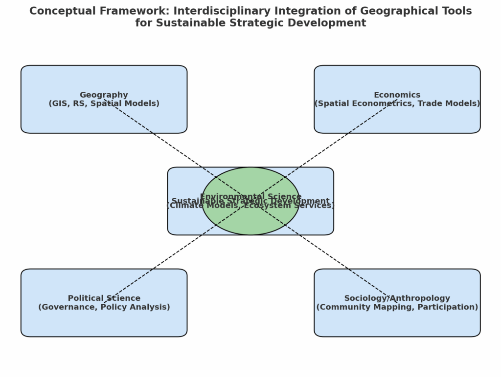 การพัฒนายุทธศาสตร์เชิงพื้นที่ที่ยั่งยืนจำเป็นต้องบูรณาการความรู้เชิงสหวิทยาการ (interdisciplinary integration) ระหว่างภูมิศาสตร์ เศรษฐศาสตร์ รัฐศาสตร์ สังคมวิทยา และวิทยาศาสตร์สิ่งแวดล้อม เนื่องจากประเด็นการพัฒนามีความซับซ้อนเกินกว่าที่ศาสตร์ใดศาสตร์หนึ่งจะแก้ไขได้ (Harvey, 1973; Sen, 1999) เครื่องมือภูมิศาสตร์ เช่น GIS, Remote Sensing และ Spatial Econometrics แม้จะมีพลังในการสร้างข้อมูลเชิงประจักษ์ แต่ก็ต้องเชื่อมโยงกับทฤษฎีทางสังคมและเศรษฐศาสตร์เพื่ออธิบายพลวัตเชิงอำนาจ ความเหลื่อมล้ำ และความยุติธรรมเชิงพื้นที่ (Lefebvre, 1991; Soja, 2010) ขณะเดียวกัน การใช้ Participatory GIS และ Community Mapping ต้องอาศัยความเข้าใจด้านมานุษยวิทยาและรัฐศาสตร์ เพื่อให้การมีส่วนร่วมของชุมชนไม่ตกเป็นเพียงสัญลักษณ์ หากแต่เสริมสร้างพลังทางการเมืองของท้องถิ่น (Ostrom, 1990) อย่างไรก็ตาม เครื่องมือเชิงเทคนิคมีแนวโน้มจะครอบงำด้วยโลกทัศน์แบบเทคโนแครต (technocratic bias) จนละเลยคุณค่าทางวัฒนธรรมและสังคมที่มิอาจแทนด้วยข้อมูลเชิงปริมาณได้ (Massey, 2005) การสร้างพลังร่วมทางความรู้จึงต้องเกิดจากการ “เชื่อมโยงหลายสาขา” (multi-scalar, multi-disciplinary synthesis) ที่หลอมรวมมิติวิทยาศาสตร์กายภาพ เศรษฐกิจการเมือง และเสียงของประชาชน เข้าสู่ยุทธศาสตร์เชิงพื้นที่ที่เป็นทั้ง ยุติธรรม–แข่งขันได้–และยืดหยุ่น อันเป็นรากฐานของการพัฒนาที่ยั่งยืน (UN, 2015; IPCC, 2022)
